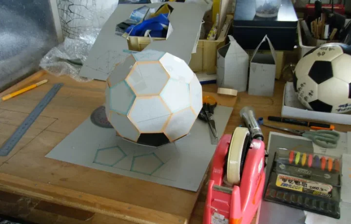 ところで、ただいまオーダーの入っているサッカーボールの形のランプを作成中です。綺麗な色のキラキラしたランプを作ろうと思っています。サッカーボールを友達の息子さんの記念サイン入りを借りて製図しているところです。サッカーボールは、五角形と六角形の組み合わせです。なかなか手がかかりそうです。