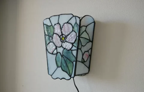 このガラスはフランス製です。照明をつけると優しくて上品な色に変化します。