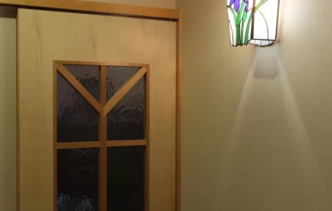 前回 ランプを2個設置したのですが、もう一つということで遅くなりましたが3個目を作ってお届けしました。全体のお部屋のバランスからすると3個が良いと思いました。また、新しくペレットストーブも設置されていて太い木の梁と漆喰、ステンドグラスの照明とペレットストーブの組み合わせは別荘のようです。