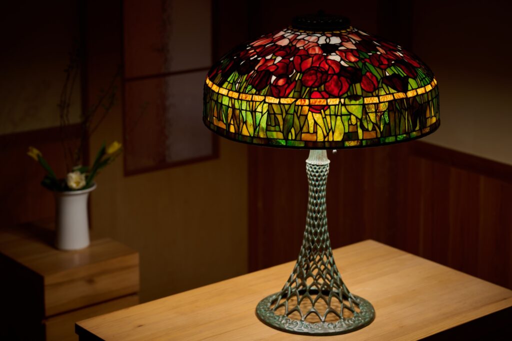 メッシュのベースに乗った、大きな赤いチューリップのランプです。特徴的な深紅の「グラニト」のごつごつしたガラスが、ゴージャスな雰囲気を生んでいます。