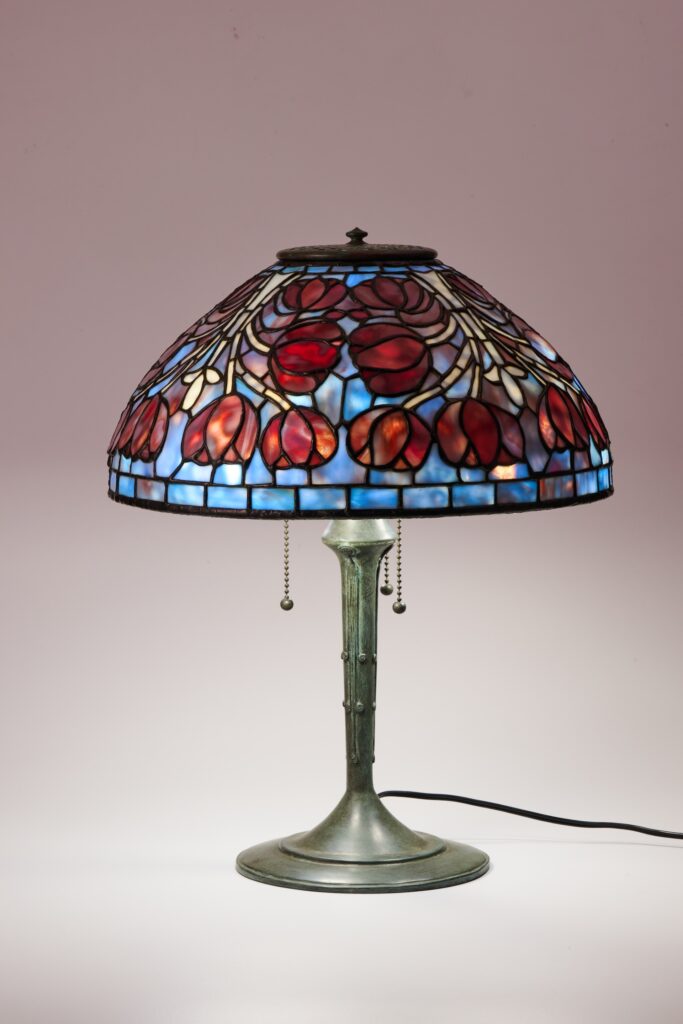 後日、木のぬくもりあふれるホールでの展示会に置いたとき、赤い花がとてもかわいらしかったのを思い出します。メインの照明の照度を落としてこのランプを灯すと、美しさがいっそう際立ちます。